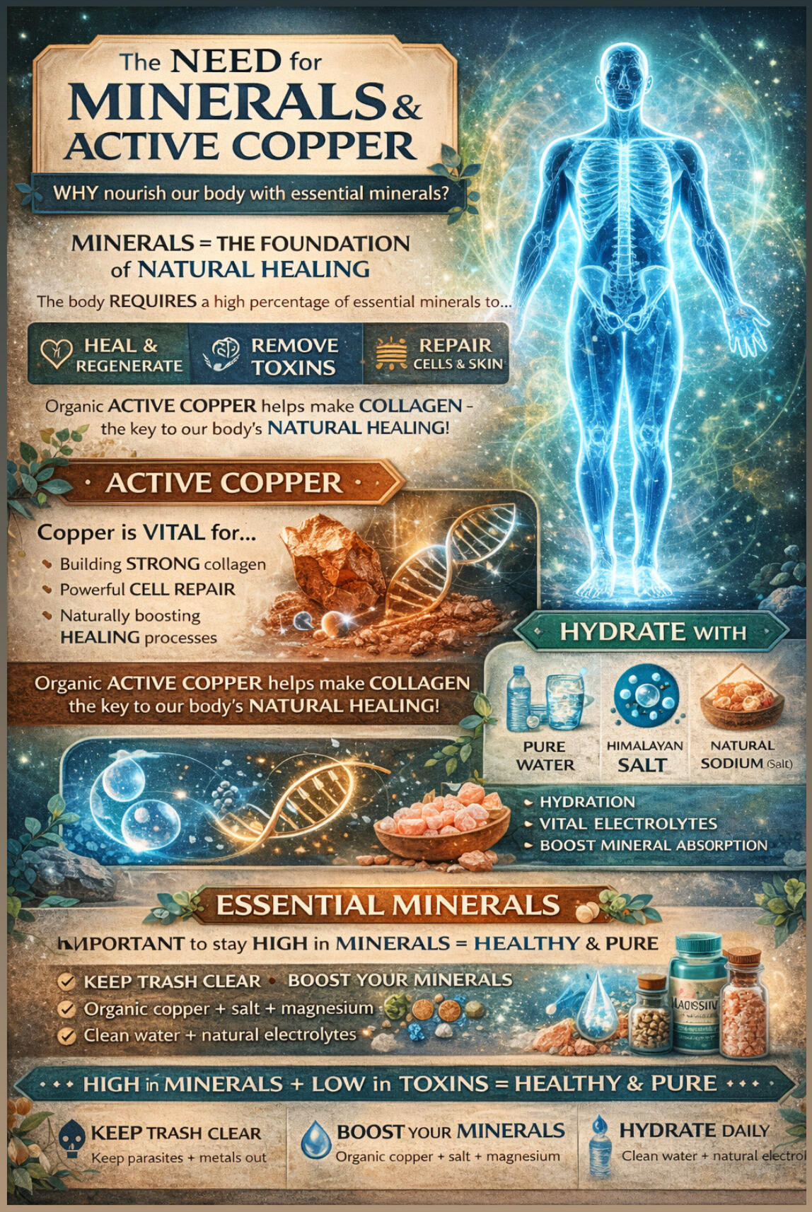 Every organ, joint, muscle, and connective tissue relies on collagen — the most abundant structural protein in the body.Collagen keeps your:skin firmjoints flexiblehair and nails strongtissues resilientinternal structures supportedBut your body cannot build or maintain collagen without the raw materials required to make it.One of the most important of these materials is bioactive copper.🔷 Why Bioactive Copper MattersBioactive copper plays a role in several natural processes the body uses to maintain structure and integrity, including:collagen cross-linkingconnective tissue formationnatural antioxidant defensesenergy productioniron utilizationWhen copper levels are adequate, the body can maintain and rebuild the collagen network that keeps everything strong and supported.When copper levels are low, collagen formation becomes harder for the body — leading to tissues that feel weaker, slower recovery, and overall diminished resiliency.(This is NOT a disease claim — it is simple nutrition + physiology.)🌱 Modern Deficiencies Are More Common Than EverDue to soil depletion, processed foods, environmental exposure, and chronic stress, many people do not receive enough:bioactive copperorganic silicazincvitamin Camino acidsfoundational mineralsThese nutrients act as the building blocks the body relies on for natural repair.A deficiency in these essential components means the body has to work significantly harder to maintain collagen, bone density, tissue strength, and overall balance.🧼 Detox: Removing the Burden So the Body Can Use Nutrients CorrectlyEven if someone supplies the right nutrients, the body may still struggle if it is:overloaded with toxinsholding onto heavy metalscarrying environmental stressorsoverwhelmed by poor gut functiondealing with internal imbalanceWhen the internal burden is high, the body directs energy into managing overload instead of repairing tissues.This is why detox support can be helpful:Detox does NOT treat or cure anything. YOUR BODY DOES THAT ALREADY